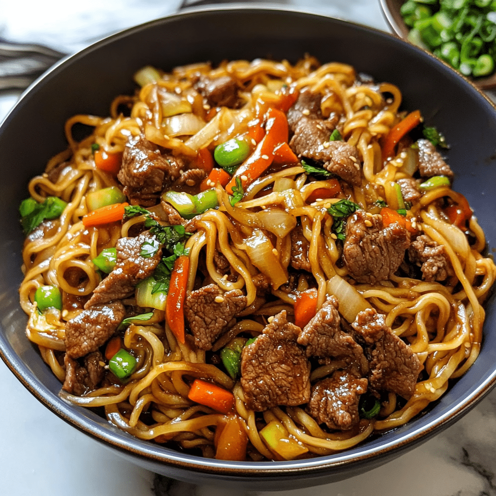 The stir-fried noodles offer a satisfying texture, and the beef adds a protein-packed punch, while the vegetables contribute both color and nutrition. This dish is highly customizable—add your favorite vegetables, switch up the protein, or adjust the sauce to your liking.