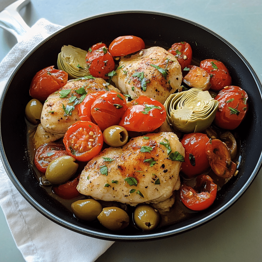 Chicken with Tomatoes, Artichokes, and Olives is a vibrant and flavorful dish that brings together a harmonious blend of savory and tangy ingredients in one satisfying meal. The tender chicken, paired with juicy tomatoes, briny olives, and earthy artichokes, creates a deliciously rich profile that will leave you craving more. Each bite offers a balance of freshness and depth, making it perfect for any occasion, whether it’s a quick weeknight dinner or a special meal for guests.