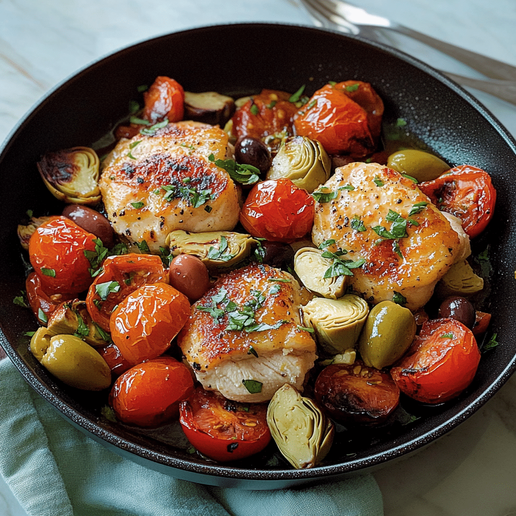 Chicken with Tomatoes, Artichokes, and Olives is a delicious and vibrant dish that combines tender chicken with bold Mediterranean flavors. The juicy tomatoes, briny olives, and tangy artichokes create a flavorful sauce that perfectly complements the chicken. This dish is not only satisfying but also a healthy option for any meal, bringing together lean protein, fresh vegetables, and deliciously rich flavors.