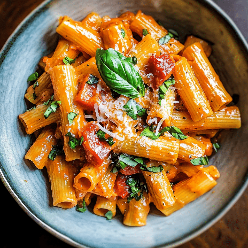 I make this dish, and the roasting of the red peppers fills the kitchen with a rich, smoky aroma that makes my mouth water. Once blended into the cream sauce, the peppers create a velvety texture that coats the pasta beautifully. As I stir in the sauce, the rich flavors come together, making the rigatoni absorb every ounce of deliciousness. Each bite is creamy, comforting, and bursting with flavor.