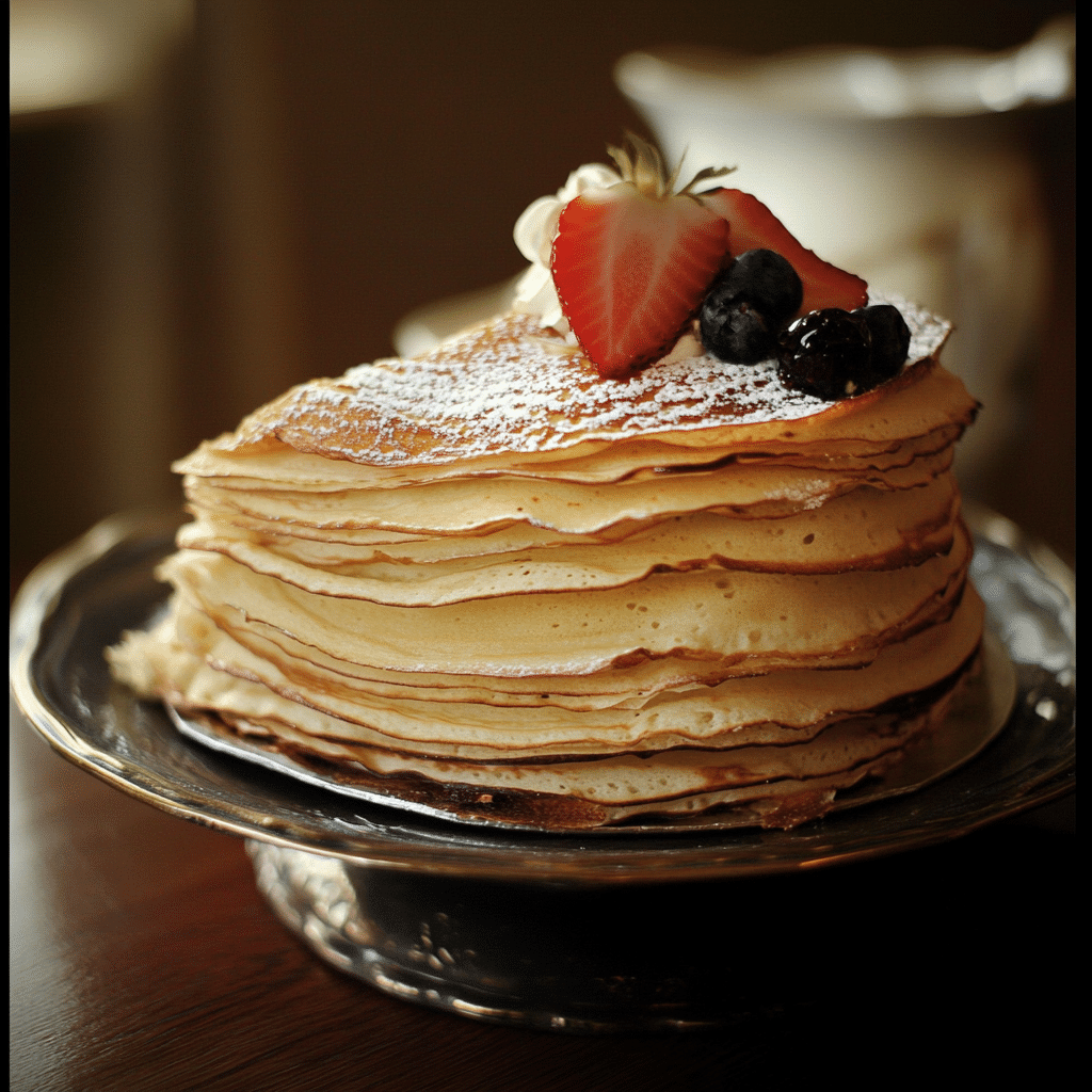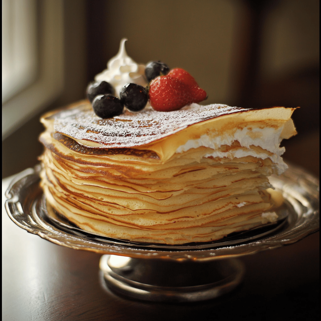 - Layer the Crepes and Filling: Place one crepe on a serving dish and spread a thin layer of cream filling on top. Continue layering crepes and cream, making sure each crepe is covered with a layer of the cream filling. Finish with a generous layer of cream on top.