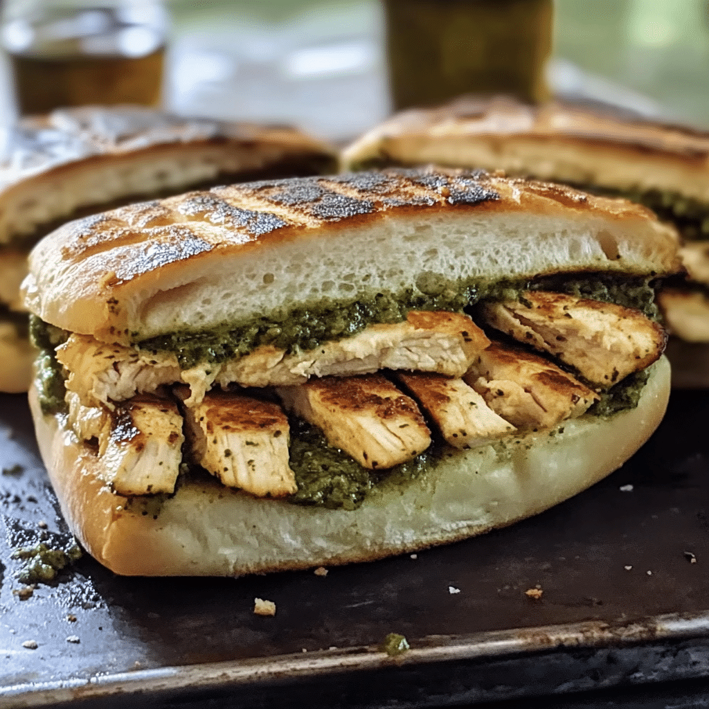I prepare this sandwich by grilling the chicken until it’s juicy and golden, filling the kitchen with a mouthwatering aroma. As the pesto spreads over the warm bread, its fresh, garlicky fragrance enhances the experience. I layer the chicken with cheese, letting it melt into rich, gooey perfection before assembling the sandwich. A final toast ensures a crisp, golden crust that perfectly complements the soft, flavorful filling.