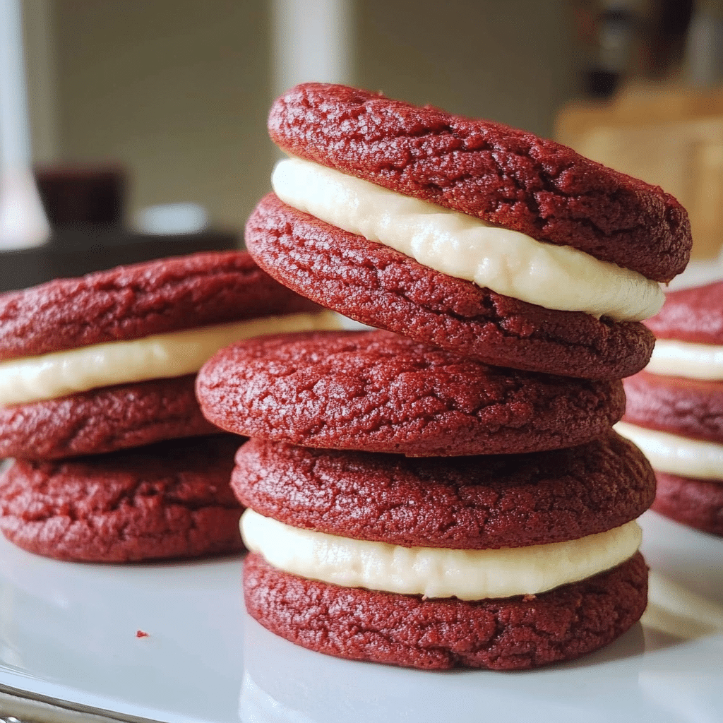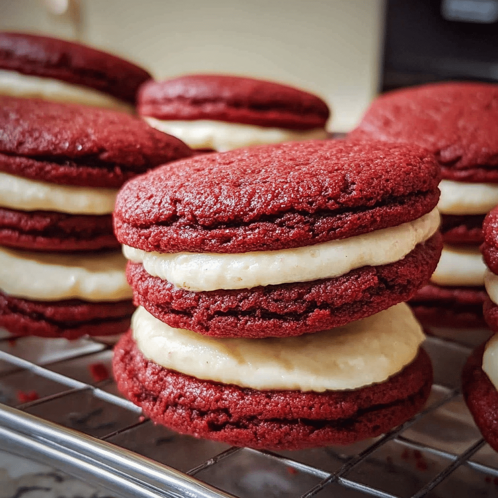 I bake these cookies, and the scent of the soft, cocoa-infused dough fills the air, making my kitchen feel like a cozy haven. As the cookies cool, I prepare the velvety cream cheese frosting, carefully spreading it between the cookies to create the perfect sandwich. With each bite, the richness of the red velvet complements the smooth, tangy frosting, creating a blissful balance of flavors.